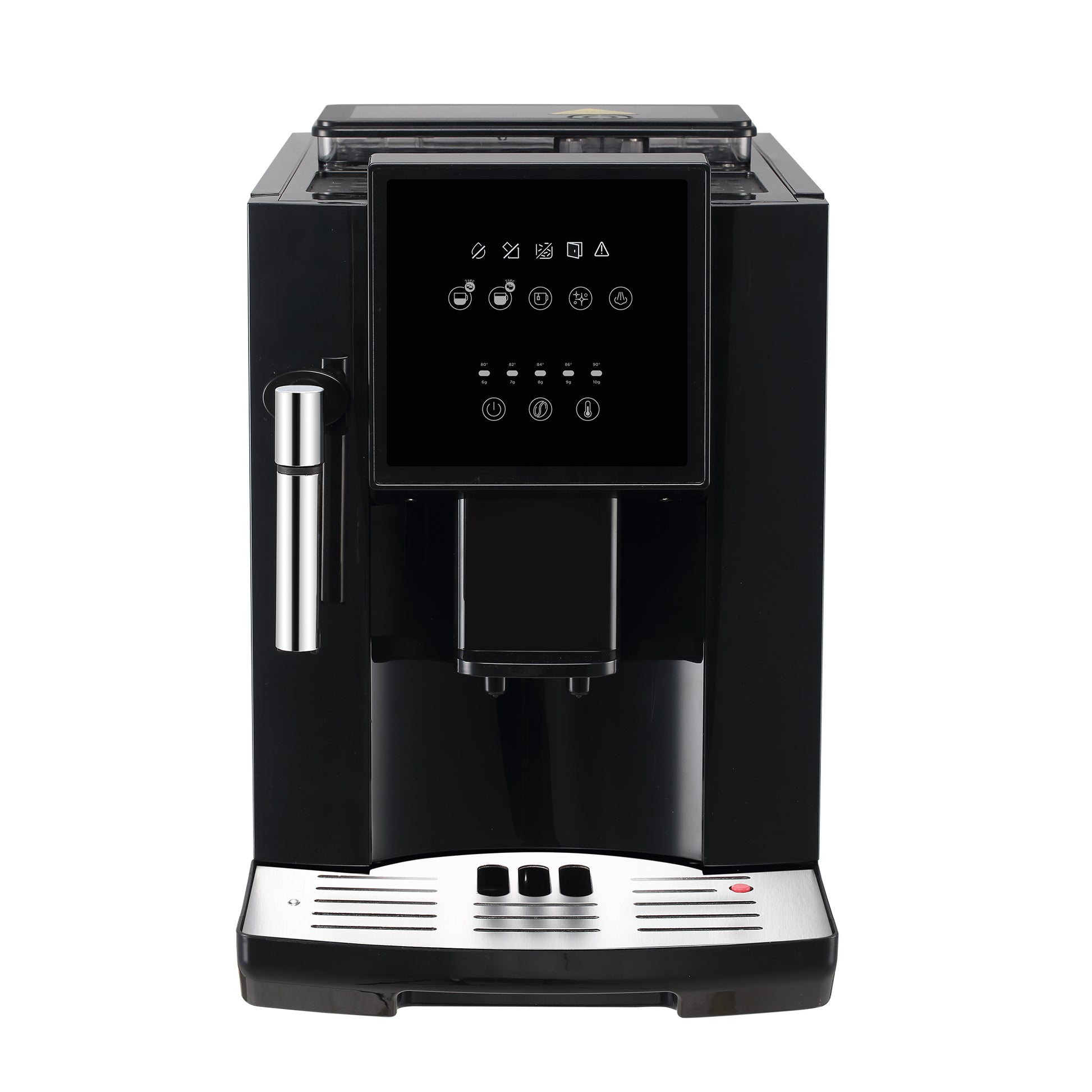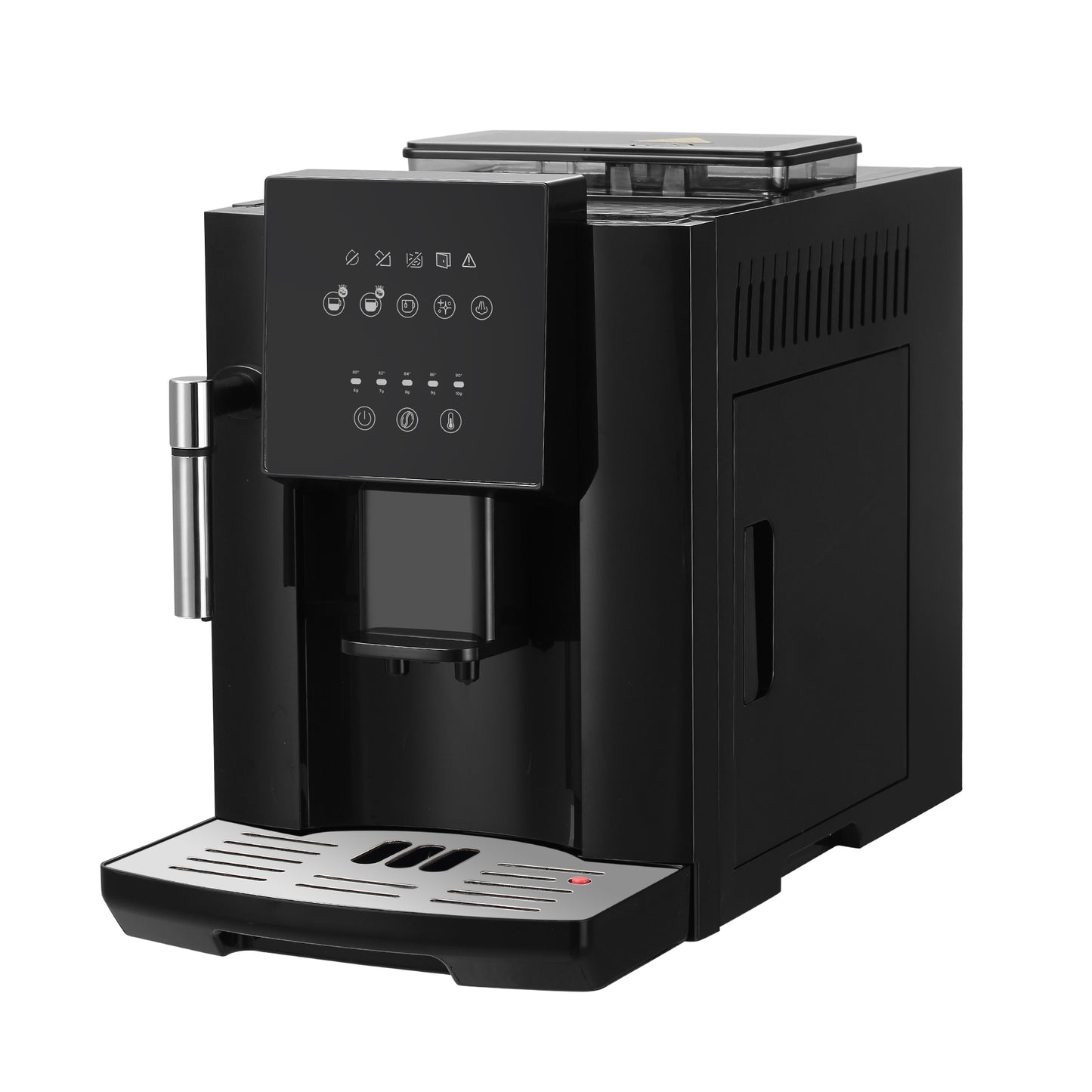 Panneau de commande ON/OFF, possibilité de café court et long, mousseur à lait.