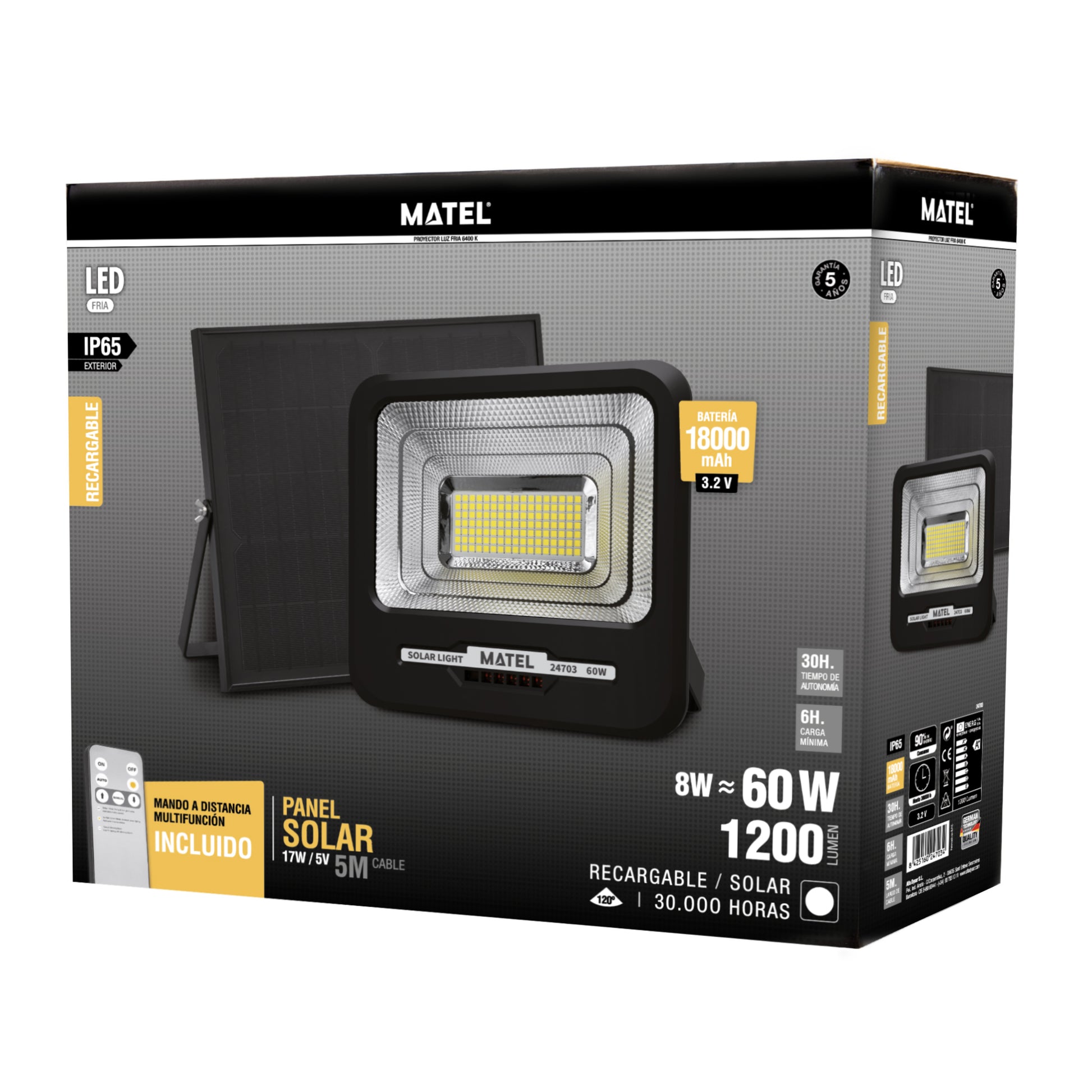 PROJETOR DE LED SOLAR RECARREGÁVEL PRETO 8-60W FRIO